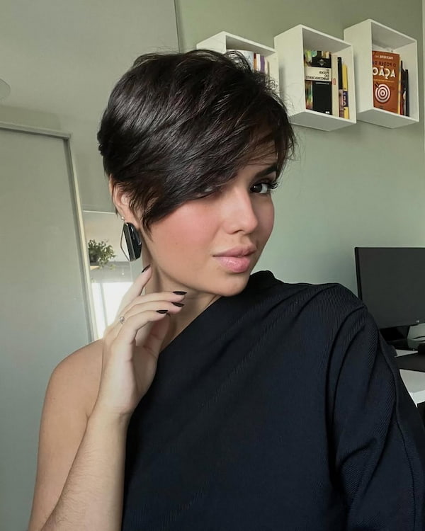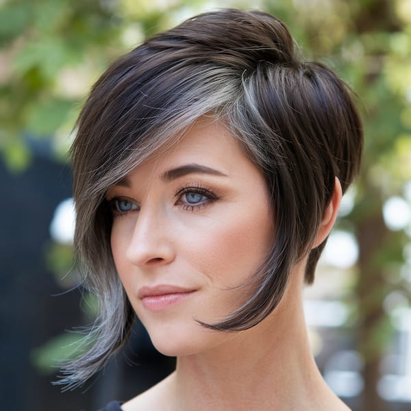 Side-Swept Pixie features a short, clean cut with longer layers swept to one side, creating a soft, elegant silhouette. This chic style adds movement and frames the face beautifully, offering a timeless, effortlessly stylish look.
