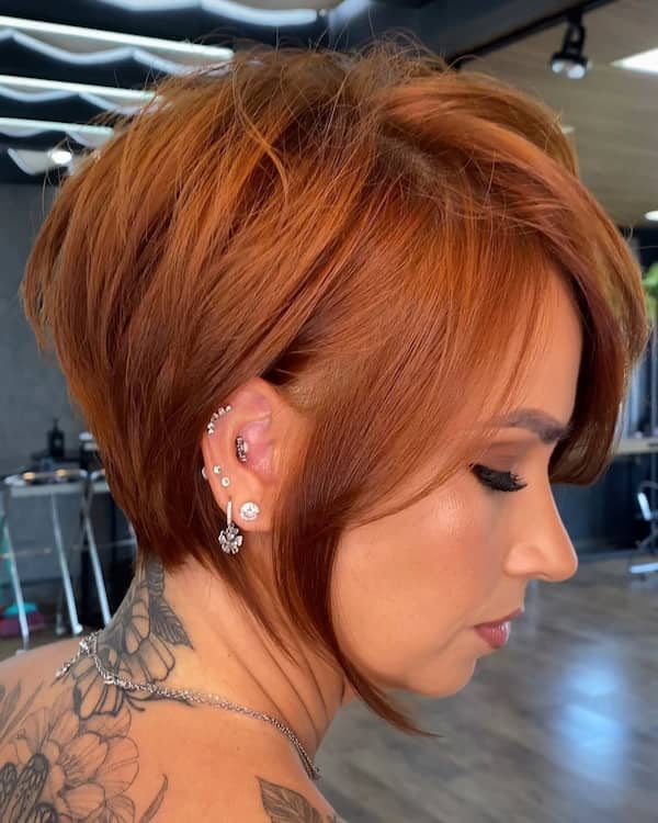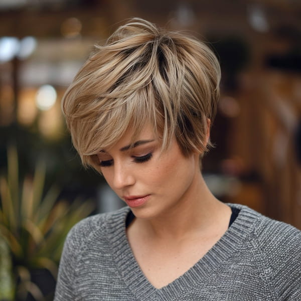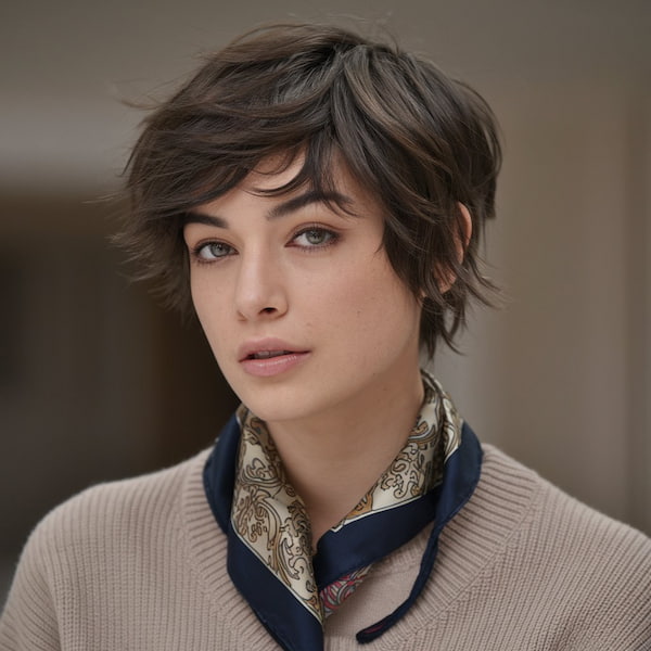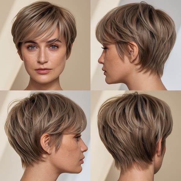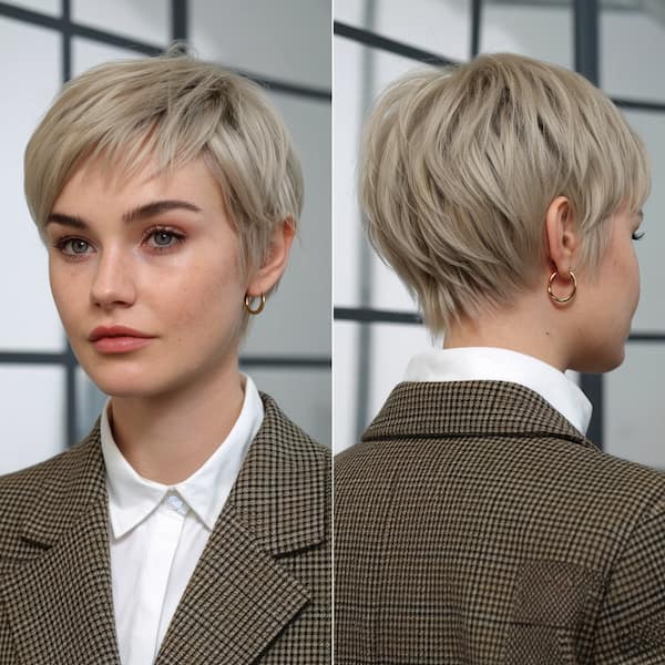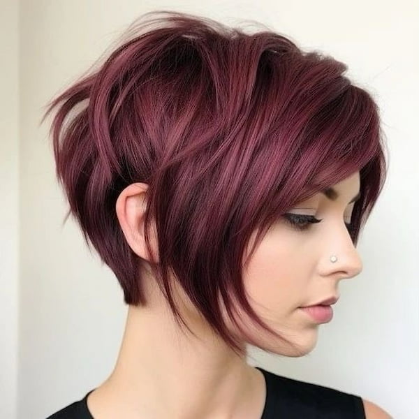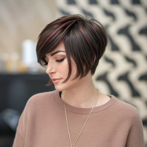 Layered Pixie with Side-Swept Bangs features soft, textured layers paired with bangs gently swept to the side. This flattering style adds dimension and movement, creating a chic, versatile look that frames the face beautifully.