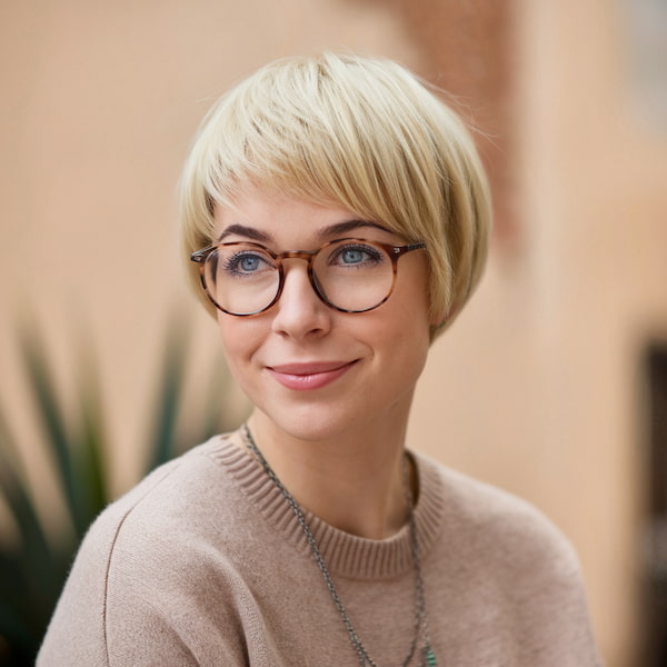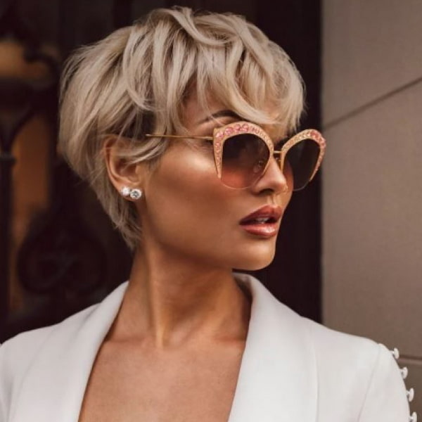Blonde Pixie with Bangs features a short, chic cut highlighted by soft bangs that frame the face. The blonde shade adds brightness and dimension, creating a fresh, youthful, and effortlessly stylish look.