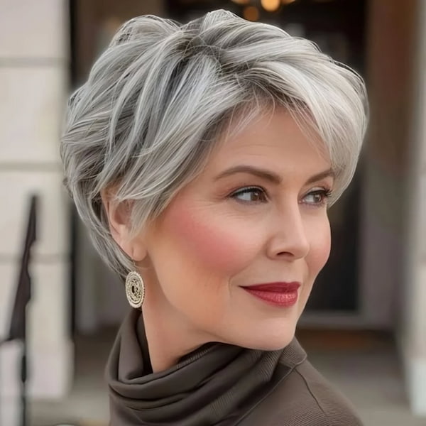 Gray Layered Pixie Bob features soft, textured layers that enhance natural gray tones with a chic, modern shape. This stylish haircut adds volume and dimension, creating a sophisticated and effortlessly elegant look perfect for embracing silver hair.