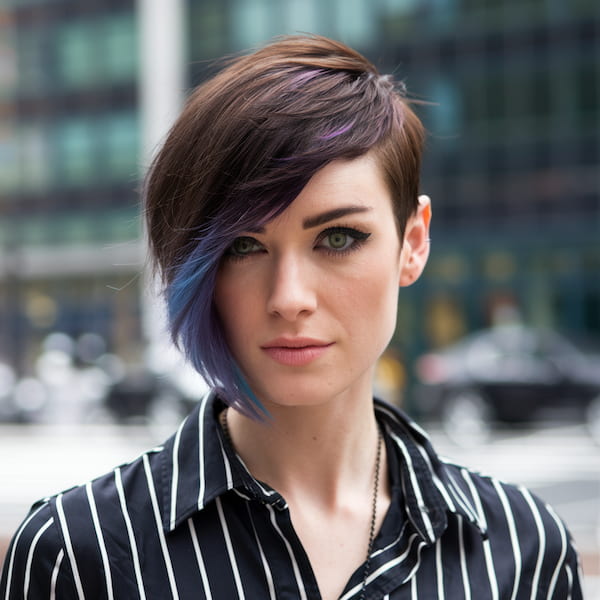 Purple Asymmetrical Pixie Bob features a bold, angled cut with one side longer for added drama, enhanced by vibrant purple tones. This edgy, fashion-forward style combines playful color with modern structure for a standout, confident look.