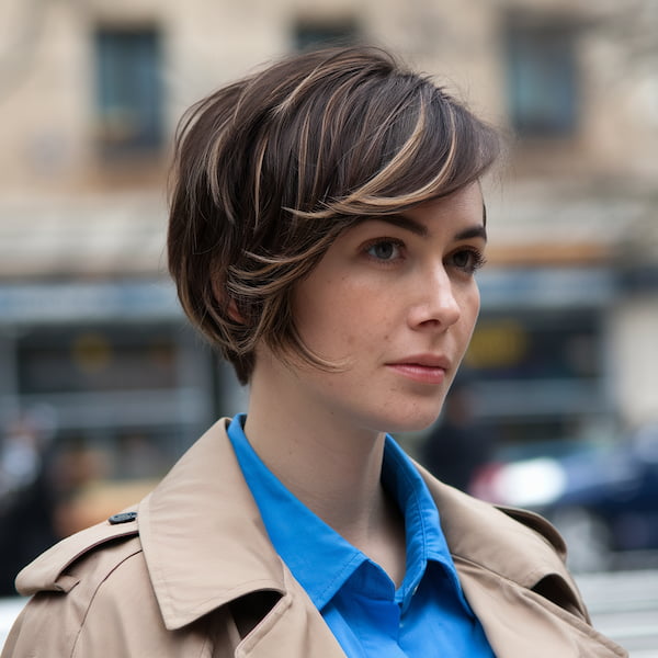 Pixie with Side-Parted Bangs features a short, textured cut complemented by bangs swept to one side. This style adds softness and dimension, creating a chic, modern look that flatters various face shapes with effortless elegance.