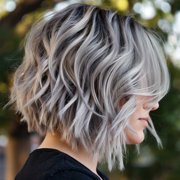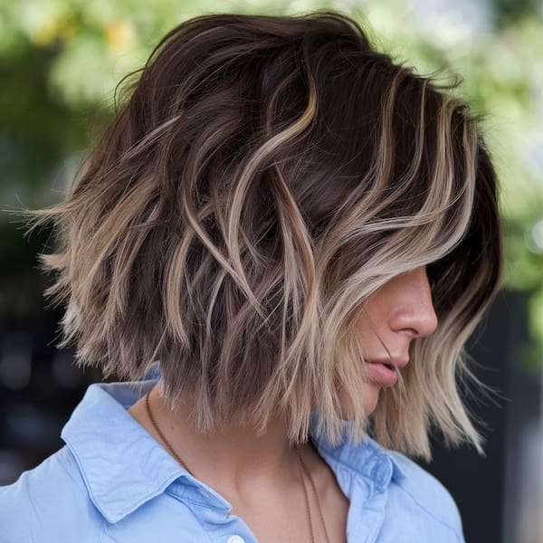 Mixed-Tone Messy Layered Bob features a blend of multiple shades that add depth and dimension to tousled, textured layers. This effortlessly chic style creates a playful, lived-in look perfect for those who love casual yet stylish hair.