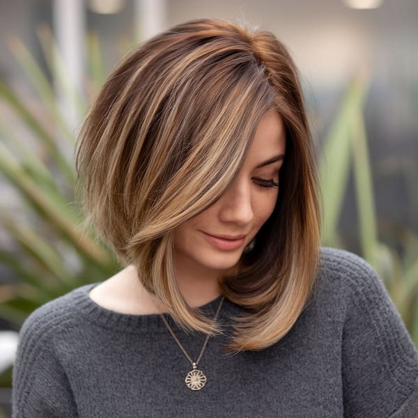 Balayage Asymmetrical Bob with Highlight blends the soft, natural gradient of balayage with the edgy flair of an asymmetrical bob. Highlights add dimension and brightness, creating a modern, stylish look perfect for all seasons.