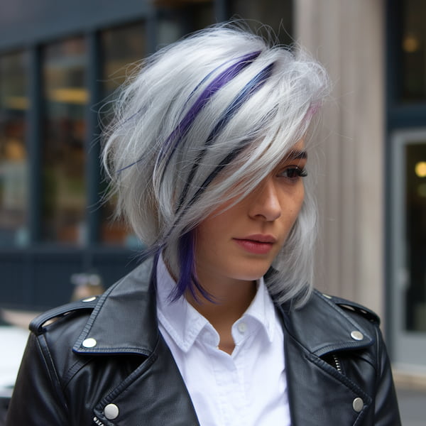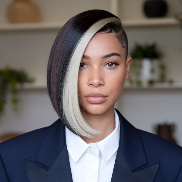 Edgy Side-Swept Bob with Blue Highlight features a sharp, angled cut with dramatic side-swept styling for a bold silhouette. Vivid blue highlights add a pop of color, creating a daring and expressive look with modern flair.