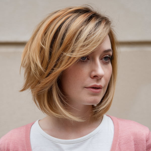 Blonde Layered Bob with Bangs features soft, face-framing layers paired with chic bangs, adding volume and movement. The bright blonde shade enhances the playful, youthful vibe, making it a stylish choice for a fresh, modern look.
