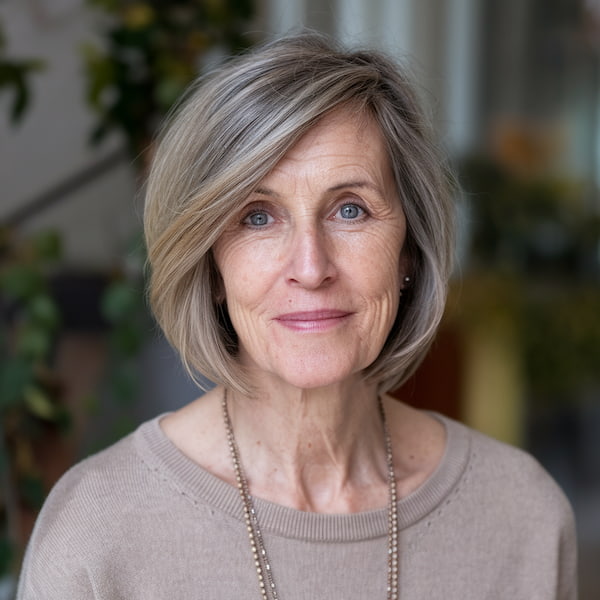 Side-Parted Bob and Bangs for Women Over 50 offers a flattering, youthful style with soft bangs and a side part that frames the face beautifully. This elegant cut adds volume and sophistication, perfect for a fresh, age-defying look.