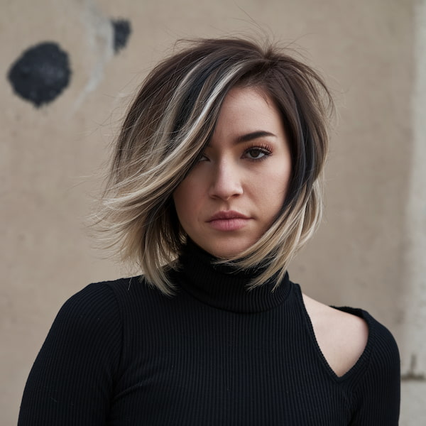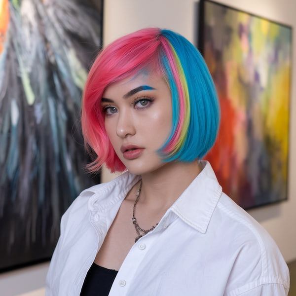 Layered Asymmetrical Bob with Brightly-Colored Highlights combines sharp, layered cuts with an uneven bob shape for a dynamic look. Brightly-colored highlights add a vibrant, playful touch, making it a standout style for those craving creativity and edge.