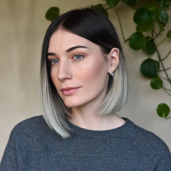 Sleek Black Bob with Blonde Ends features a smooth, glossy black base that transitions into striking blonde tips. This bold contrast creates a modern, edgy look with a touch of sophistication and flair.