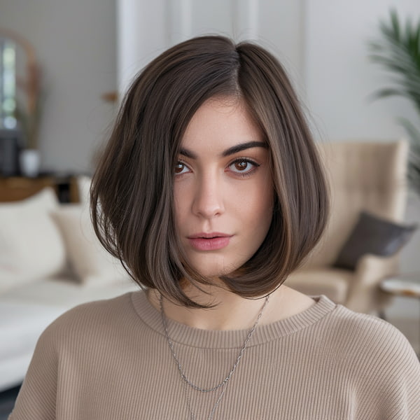 Side-Parted Bob with Polished Finishes features a clean side part and smooth, sleek styling for a refined, elegant look. This timeless haircut emphasizes sharp lines and glossy texture, perfect for a sophisticated, professional appearance.