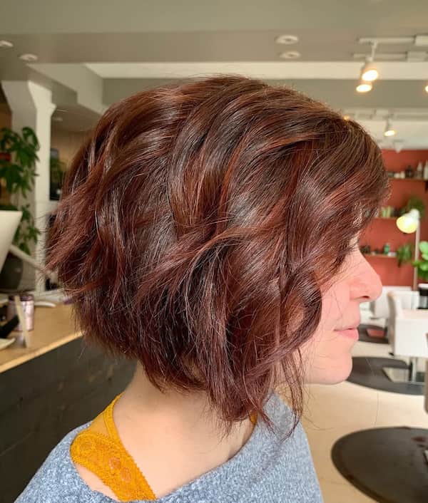 Textured Side-Swept Bob for Full Hair features layered, tousled waves that add volume and movement, perfectly complementing thick hair. The side-swept style softens the look, creating a chic and effortlessly stylish finish.